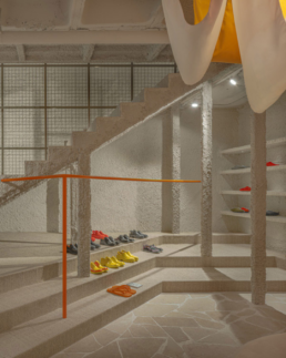 También es muy interesante el espacio de Cuadernos Rubio, diseñado por Masquespacio, propone una reinterpretación contemporánea de una marca arraigada en la memoria colectiva. El proyecto combina color, geometría y referencias gráficas para crear un entorno lúdico y reconocible, donde el diseño interior se convierte en una herramienta narrativa. El resultado es un espacio que conecta tradición e innovación, transformando la tienda en una experiencia que refuerza el valor emocional de la marca.