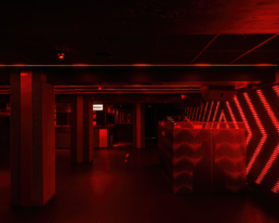 Siguiendo con Clap Studio, han diseñado también el interior de la discoteca Oven. Aprovechando su nombre como metáfora, convierten el interior en un «horno», y de ahí el uso de colores que se mueven en la escala cromática de los rojos, dando lugar a una atmósfera que, acompañada por pantallas en las que se proyectan llamas, transportan a los asistentes a un universo conceptual. Materialmente, emplean el acero inoxidable y la madera Alpi en rojos y negros.