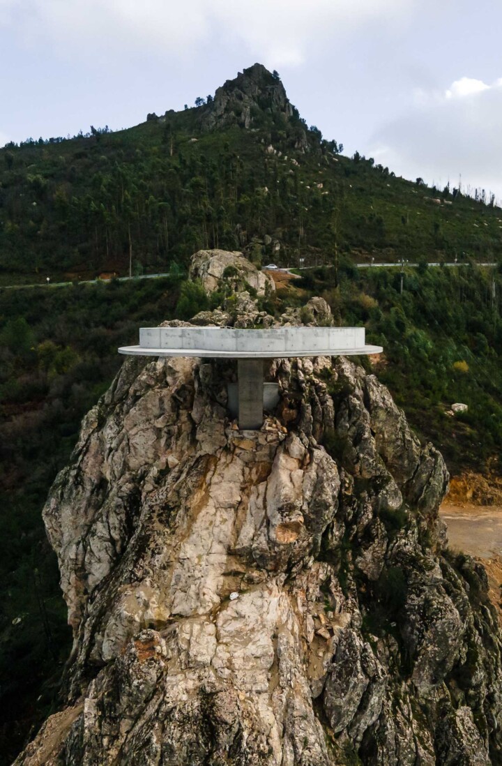 El diseño del Mirador de Zebro es tan imponente como simple. Se compone de una plataforma circular sostenida en consola, fijada directamente a la roca y construida en concreto armado a la vista, un material que dialoga perfectamente con el entorno rocoso que lo rodea. La estructura parece flotar sobre el paisaje, integrándose armoniosamente en el entorno natural y ofreciendo una experiencia visual única.