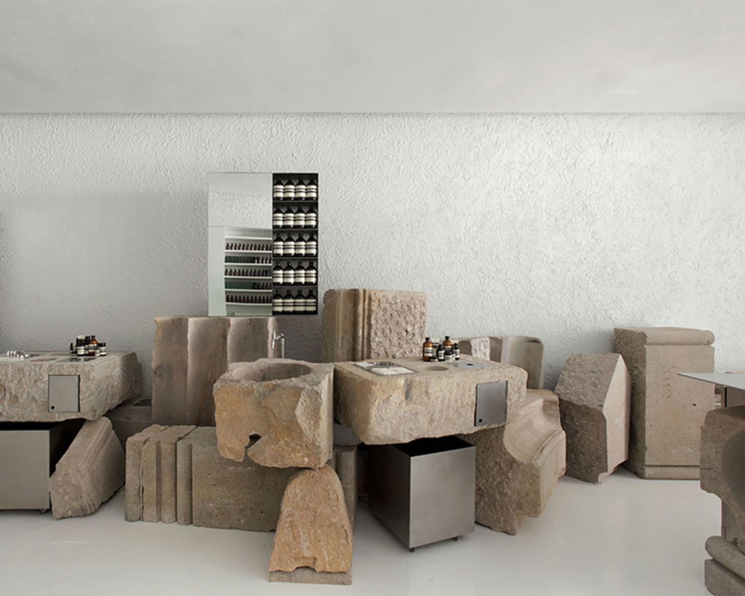 We’ll start with Aesop, as Barcelona is lucky enough to have two stores that are true authorial pieces. The first, designed by Barozzi Veiga, is an exercise in spatial purity where calm becomes almost tangible. The second, by Mesura, interprets the Aesop universe with a warmer sensibility, playing with textures and geometries that envelop the visitor in an intimate way. Visiting both shows how a single brand can adopt completely different languages without losing its essence.