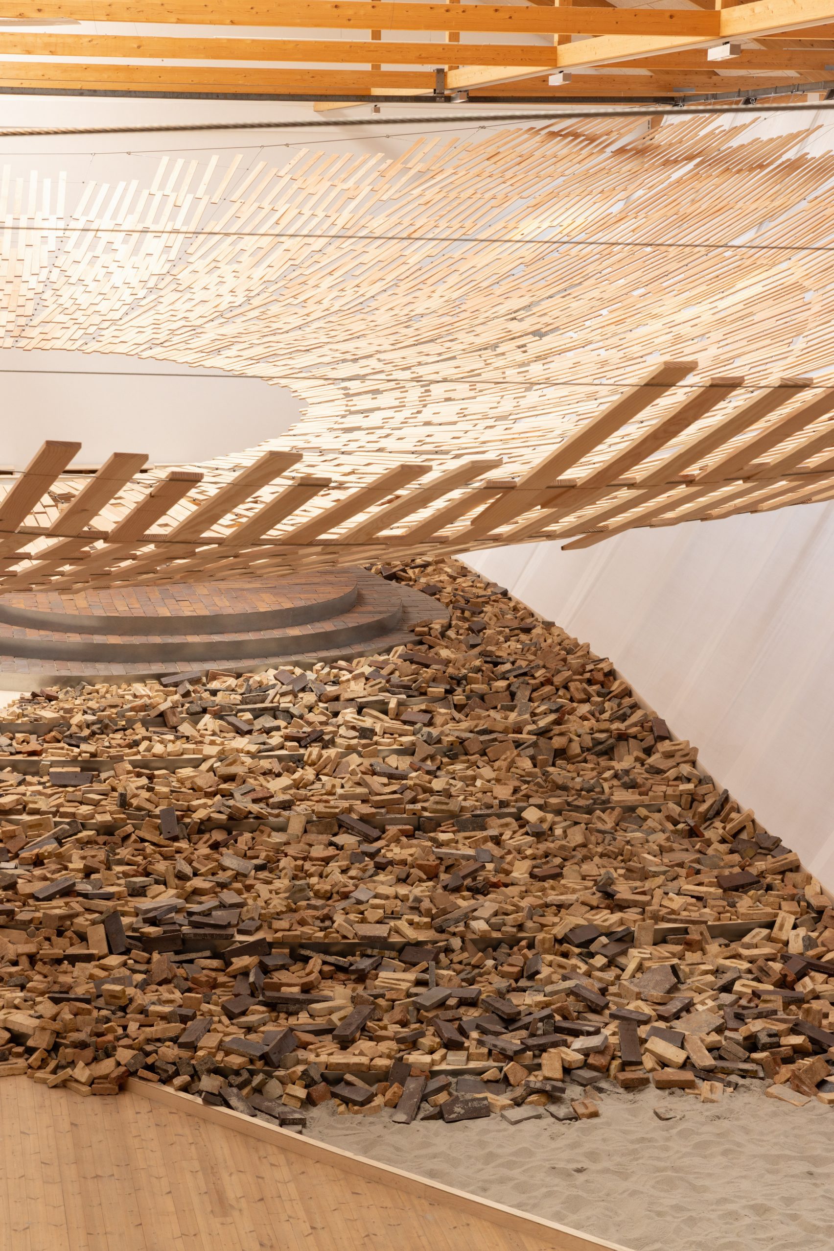 The installation is structured through a series of wooden elements arranged to create a light and permeable system. This configuration allows light, air, and shadows to pass through the space, producing a constantly shifting atmosphere that evolves throughout the day. Architecture no longer acts as a boundary, but as a filter mediating between the environment and the visitor.