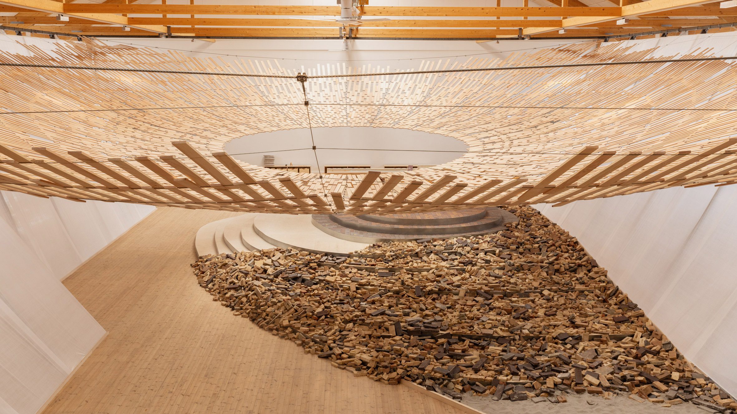 At the CC of Copenhagen Contemporary, the leading international art center in Copenhagen dedicated to installation art and located in a former welding hall in the industrial area of Refshaleøen, the project Earth/Tree, designed by Kengo Kuma and his studio Kengo Kuma and Associates, has been inaugurated. The project proposes a sensory experience that places the visitor at the center of an architecture built from material and perception. The intervention is conceived as an open environment to be explored and experienced, where the relationship between body, space, and nature takes on a central role.